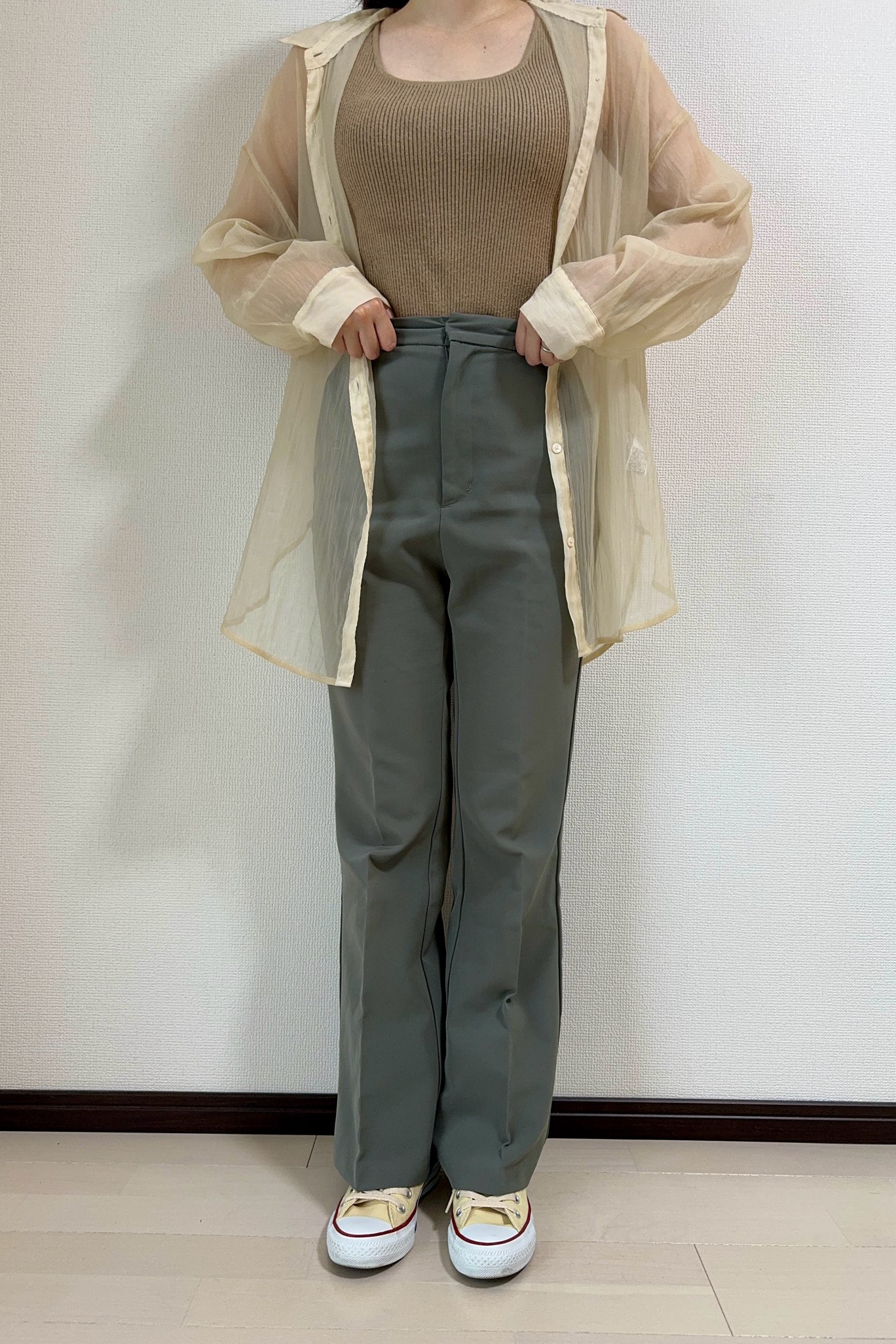 薄いオレンジのシアーブラウスにカーキのパンツを合わせると、お互いをうまく引き立てトーンに差があるので色同士がぶつかることもなく仕上がります。