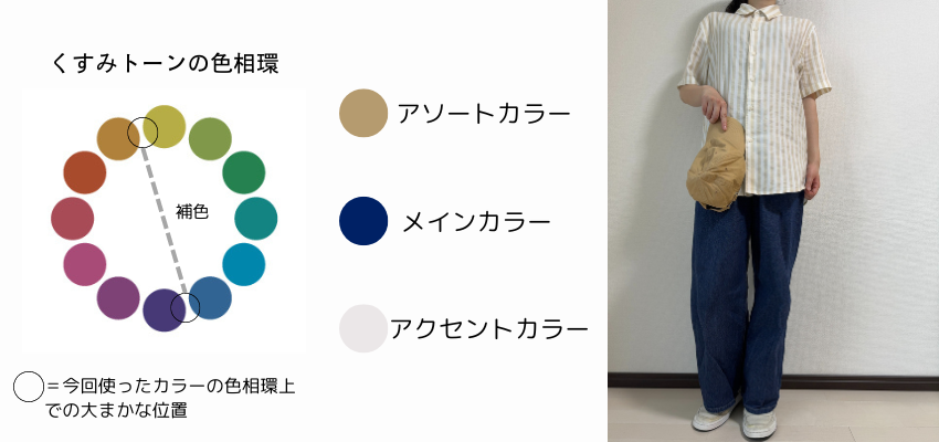 例えばベージュとホワイトのストライプシャツを取り入れたい場合、ベージュの補色はブルー系なのでデニムパンツをセレクト。