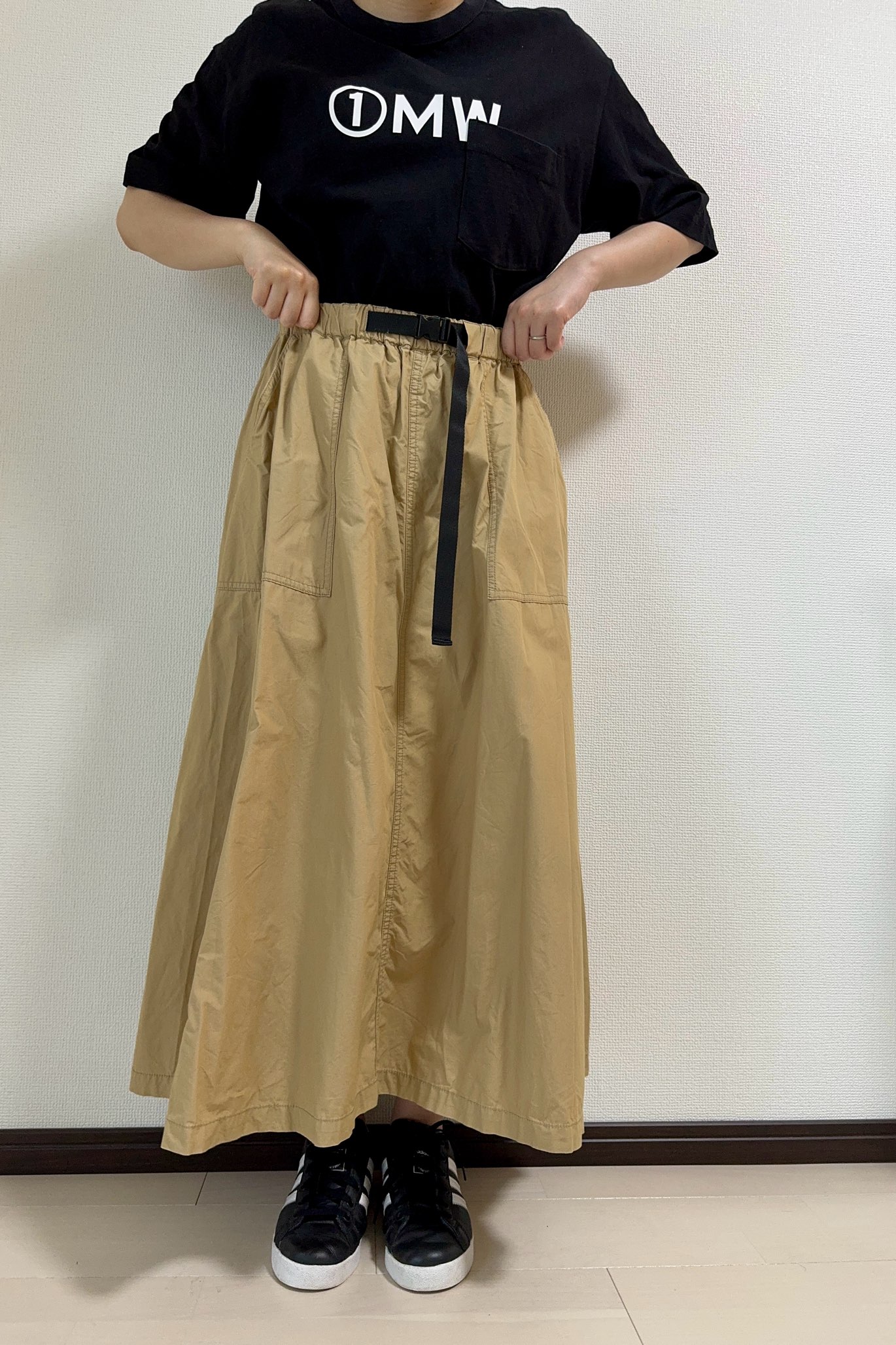 代わりに薄いベージュのベルトとシューズを合わせると、メリハリが生まれます。