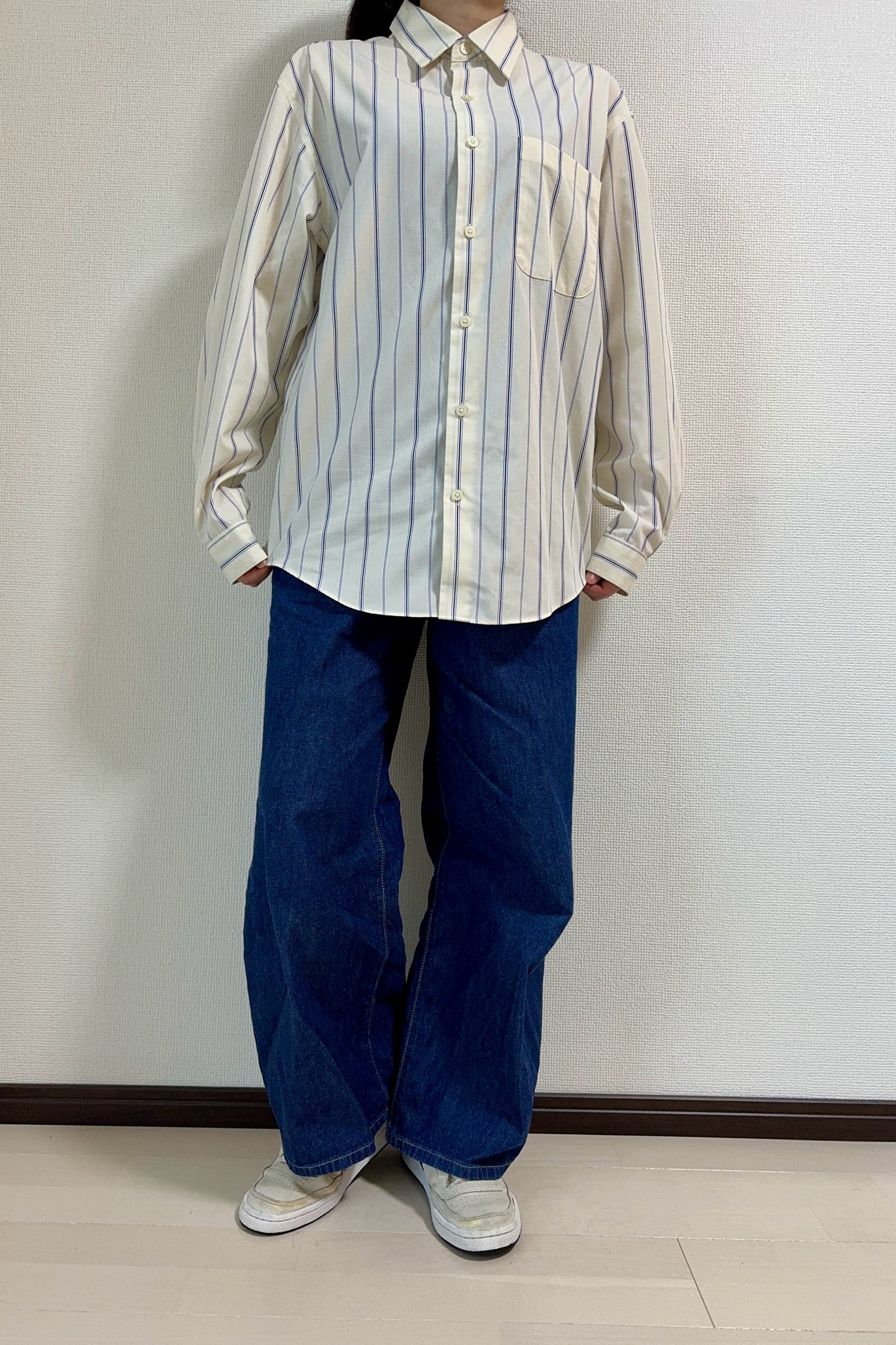 ブルーとクリームのストライプシャツを使って、コーディネートしてみました。