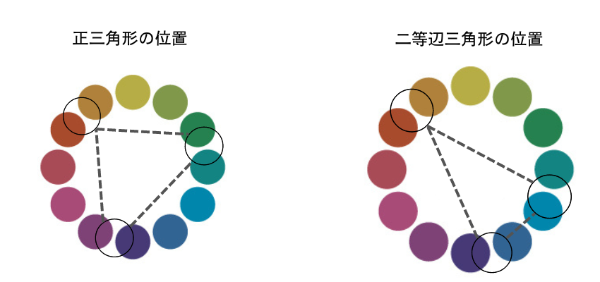 少し難しいですが、3色が色相環上で正三角形もしくは二等辺三角形上に位置する色で組み合わせられる配色にするという方法もあります。