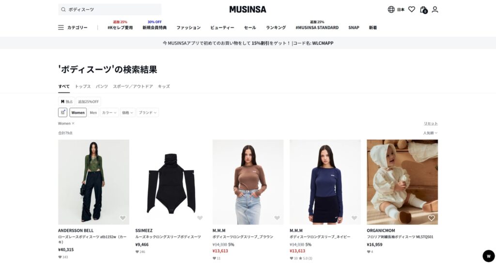 1300万人以上の会員を抱える韓国のオンラインファッションプラットフォーム「MUSINSA」では、多彩なデザインのボディスーツが展開されており、韓国で流行していることがわかりますね。