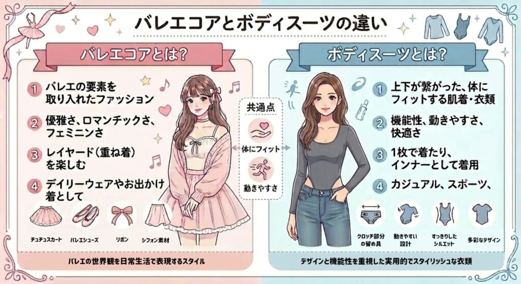 A.違います。バレエコアはファッションのスタイル名であり、ボディスーツは服の名称です。